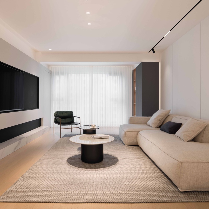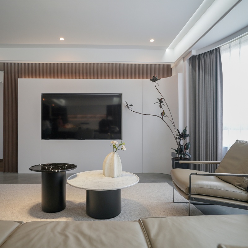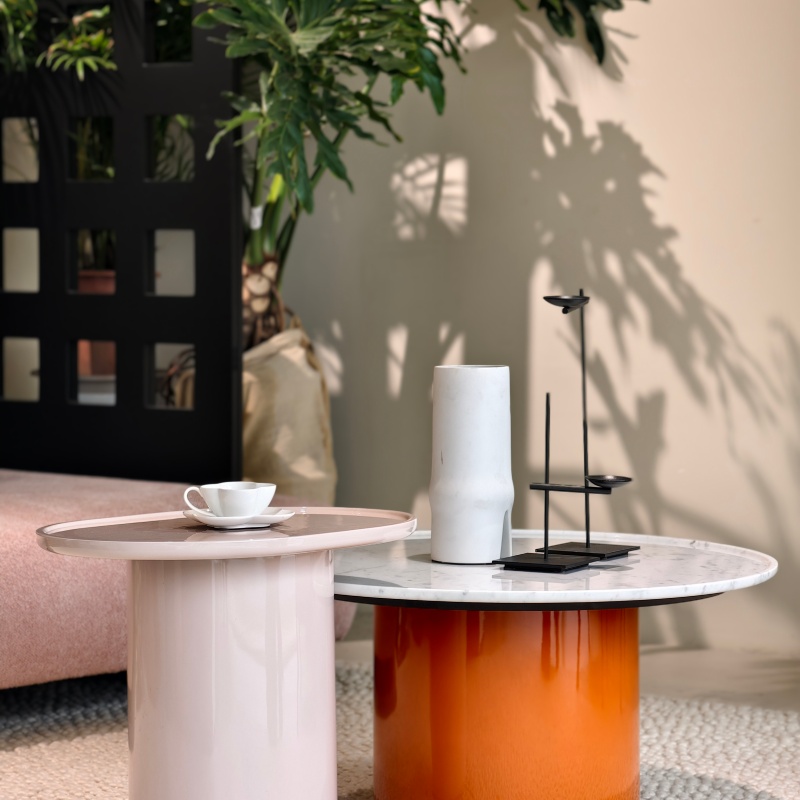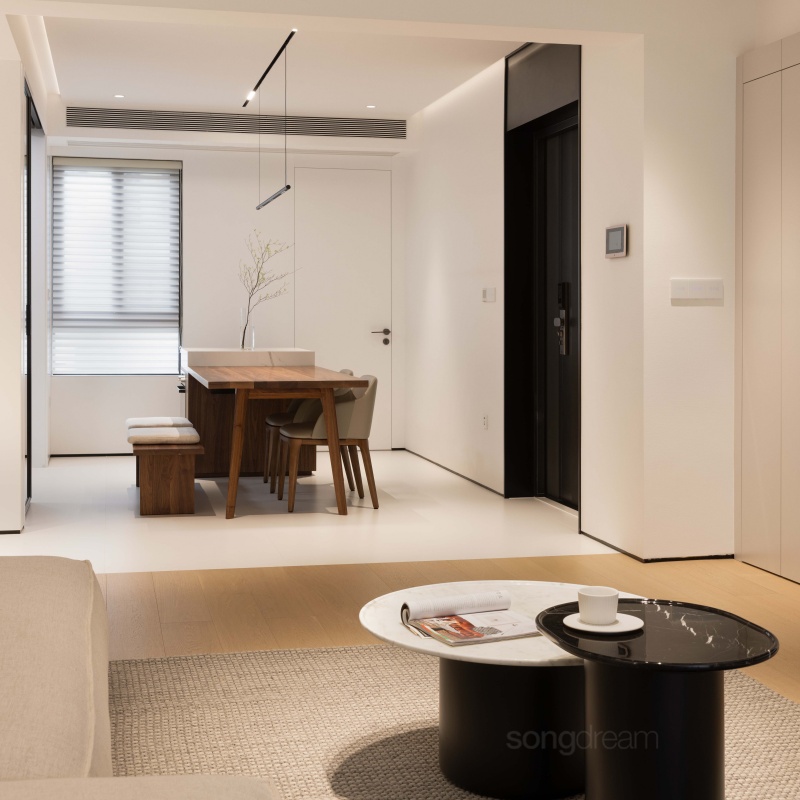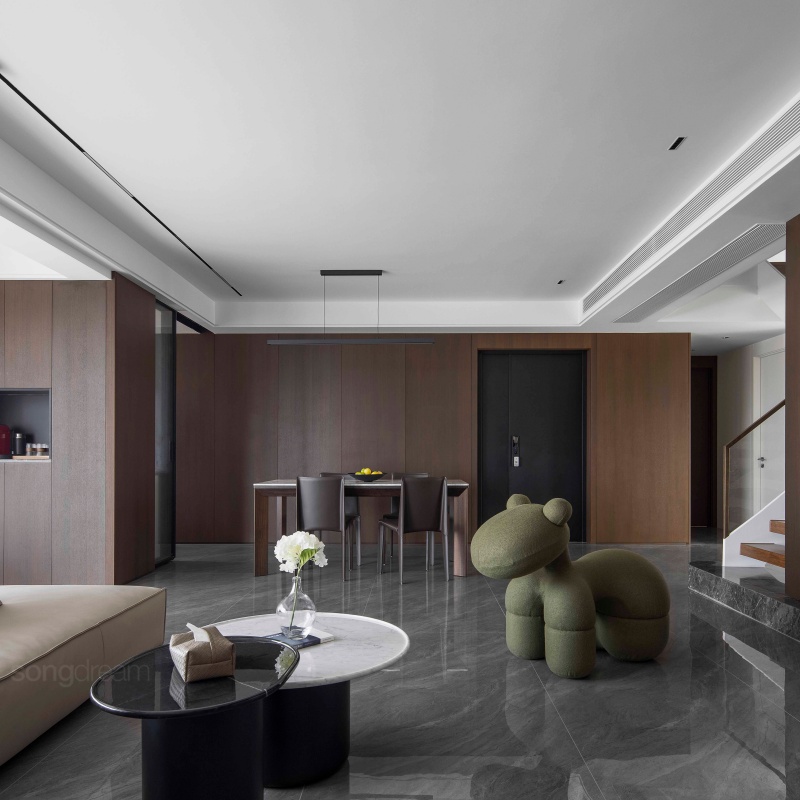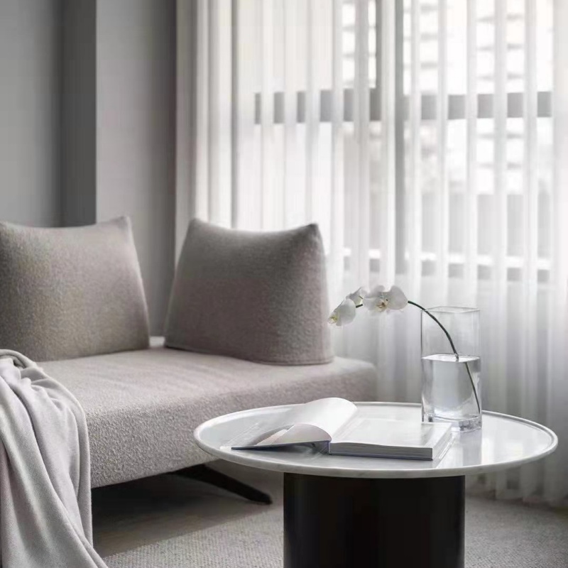 托盤茶幾簡便輕盈,實(shí)木和水磨石的結(jié)合相映成趣